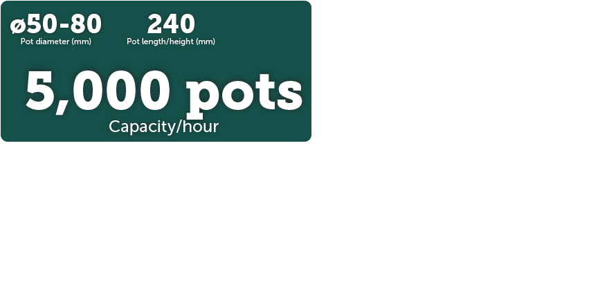 On this machine, you can produce pots in size Ø50-80 mm on a single production line. H-211 is used for operations where only one size pot/plug is required for either propagation or stepping up young plants into bigger pots. The H-211 is widely used by customers within various segments such as fruits, nuts, bedding plants, forestry and more.